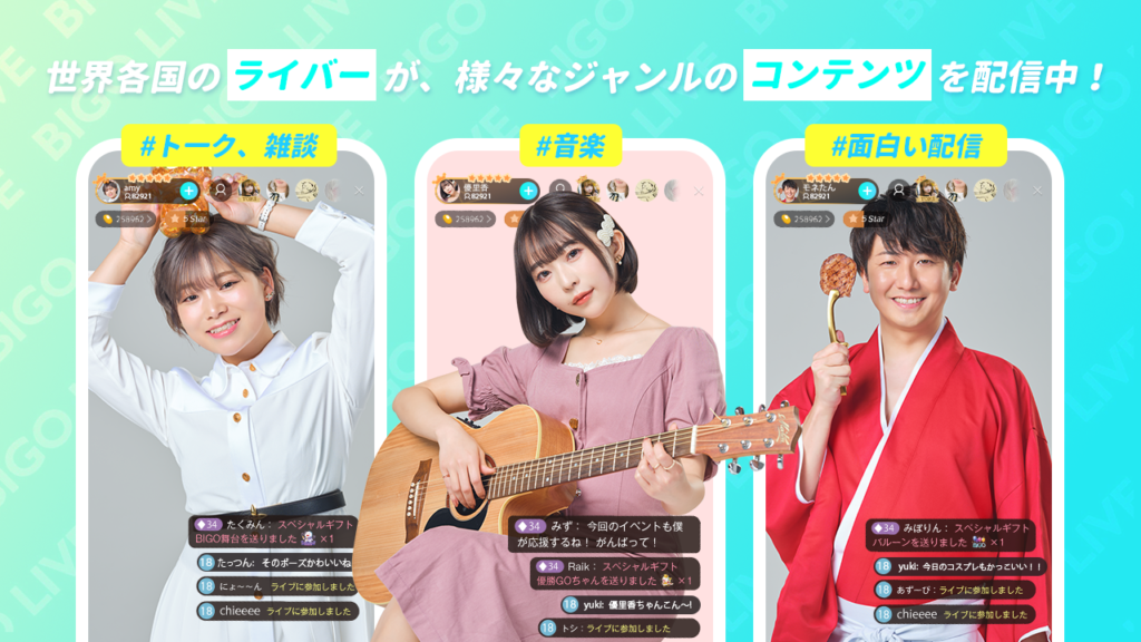 「BIGO LIVE」では、リスナーを飽きさせないように、様々な配信スタイルが用意されています。