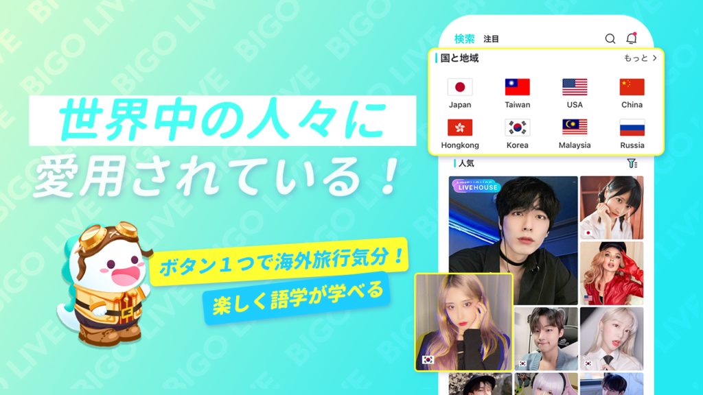 「BIGO LIVE」はシンガポールの会社が運営し、全世界で4億人以上のユーザーを持つグローバルなライブ配信プラットフォームです。日本国内ではライバルが少なく、国際的なコミュニケーションを視野に入れている人には特に適しています。