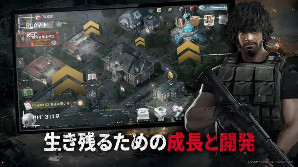 『バイオハザード サバイバルユニット』の核となるゲームシステムは、「バイオハザード」の世界観をベースとしたストラテジーです。プレイヤーは、荒廃した環境の中で、いかに効率的かつ戦略的に生存圏を築き上げるかという「決断」を常に迫られます。このシステムは「オープンワールドで資源集め→自らの拠点を強化!」というサイクルを繰り返す、いわゆる「城ゲー」と呼ばれるジャンルであり、コツコツと資源を集めて強くなっていくことを目標としています。