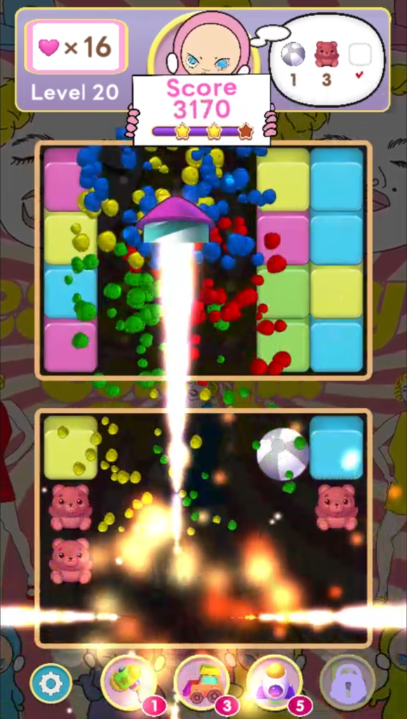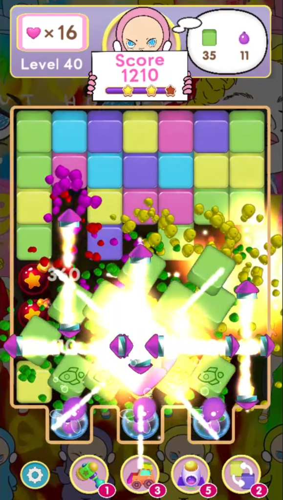 - アイテム生成: 同じ色のブロックを5つ以上繋げて消すと、ロケットやボムといった、大量のブロックを消せる強力なアイテムが出現します。これらのアイテムは、難易度の高いステージや特定のクリア条件を達成する上で不可欠な要素となります。
