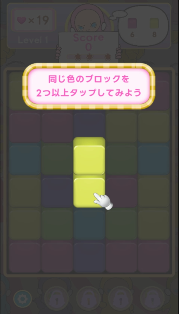 - ブロックの消去: 2つ以上隣接した同じ色のブロックをタップして消します。