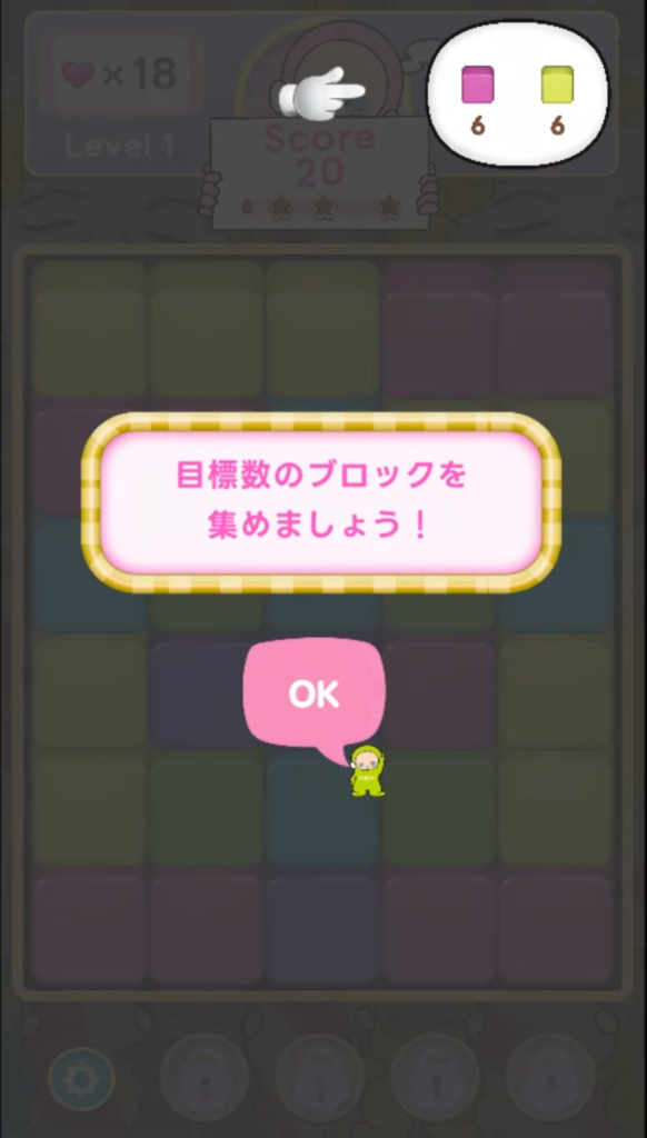 各ステージには明確なクリア条件が設定されています。例えば、「規定回数以内に赤色のブロックを〇〇個消す」といった具体的な目標が与えられ、プレイヤーはこの条件を達成することを目指します。規定回数(ムーブ数)を使い切る前に条件を達成できればステージクリアとなります。