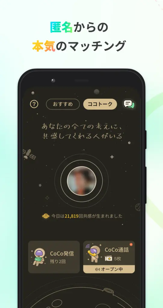 - ココトーク: 匿名で日常のつぶやきや意見を投稿できるコミュニティ空間です。投稿に共感した相手とメッセージを3回交わすとプロフィールが閲覧可能になるため、価値観から始まる出会いを提供します。