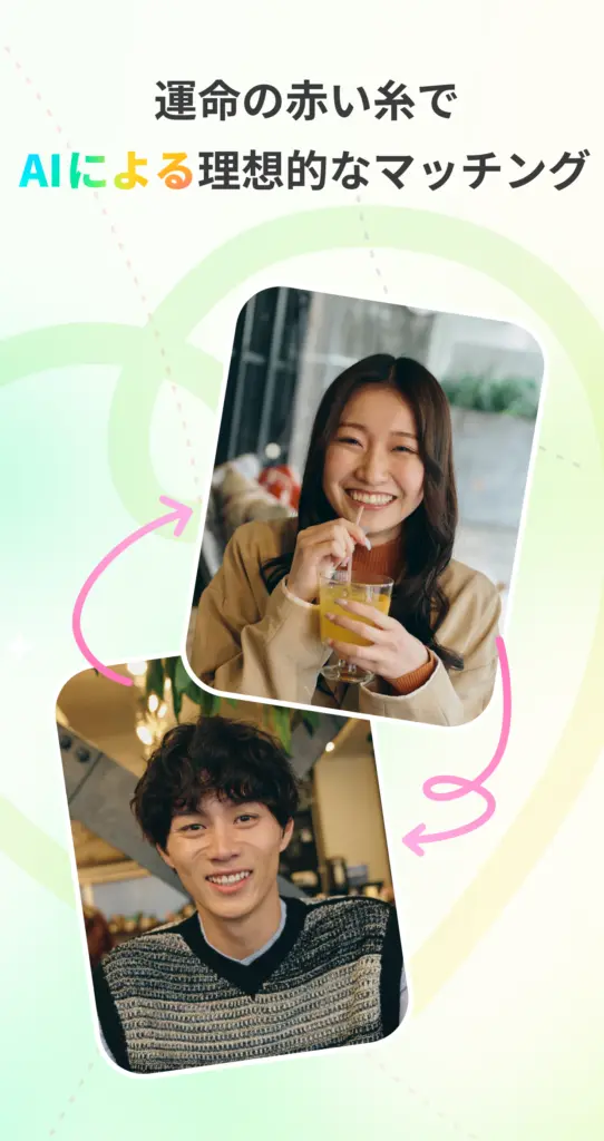 - 運命の赤い糸: AIが分析したマッチ度の高い相手と自動で繋いでくれる機能です。メッセージを3往復するまで写真が解禁されない仕組みもあり、内面から仲を深められます。