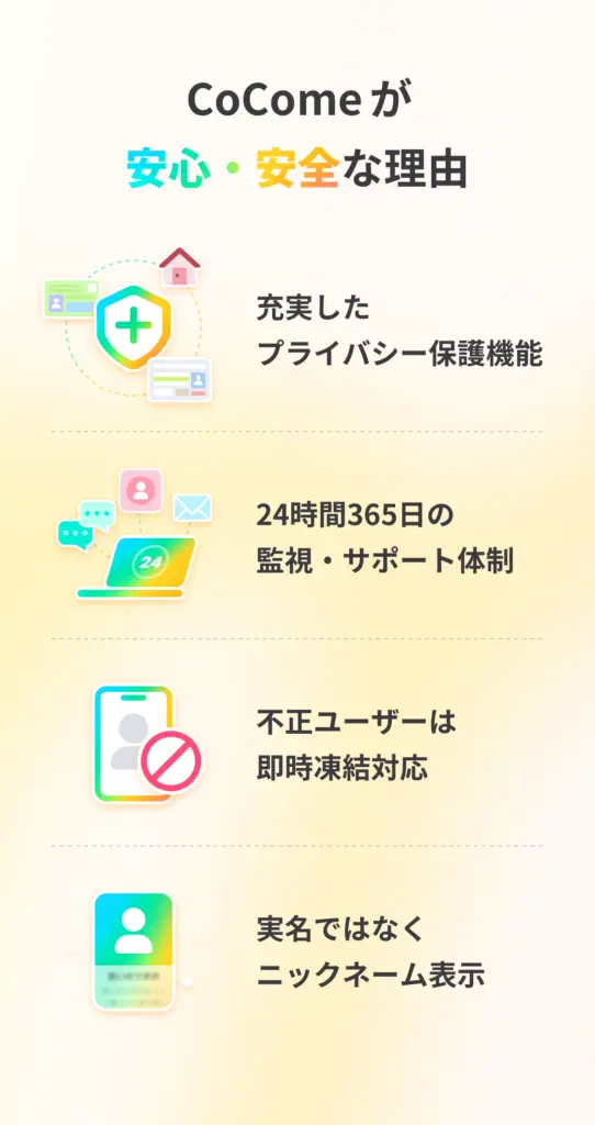 CoComeは、従来のスペック偏重なマッチングアプリに疲れ、「もっと自然に、そして絶対にバレずに活動したい」と願う層にとって非常に価値のあるアプリです。