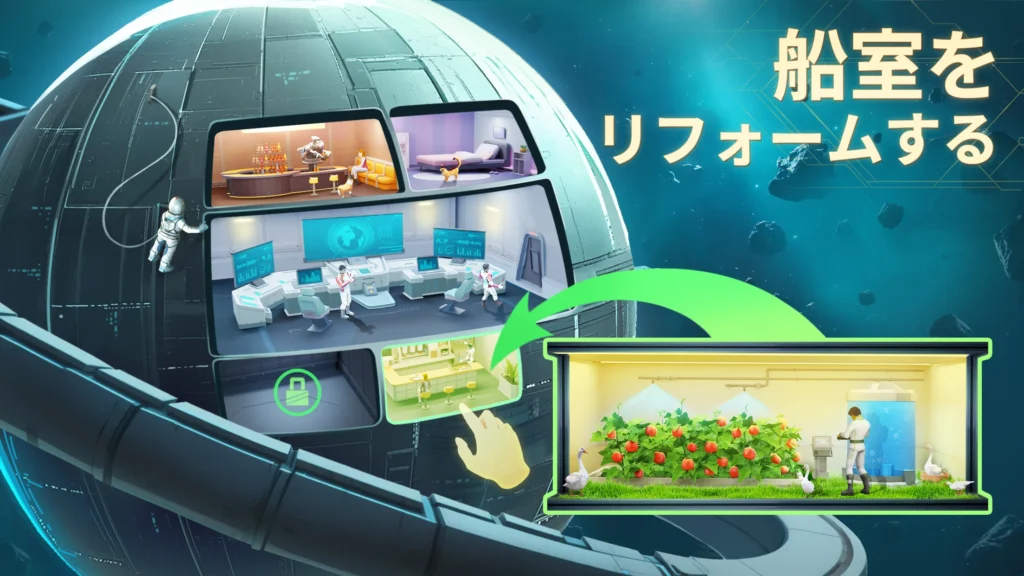 マザーシップ内では、食料生産、浄水システム、酸素循環といった生存に不可欠な設備から、主砲のアップグレード、移動速度の向上といった軍事設備まで、プレイヤーの好みに合わせて自由に建造・拡張できます。リソース管理の要素もあり、限られたエネルギーをどの施設に割り振るかといった経営シミュレーション的な楽しみも味わえます。