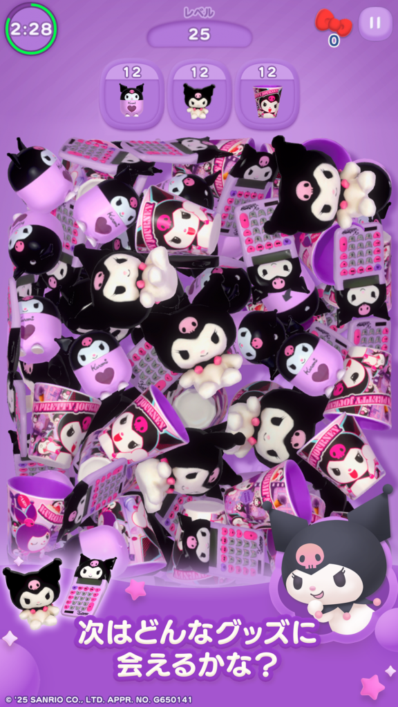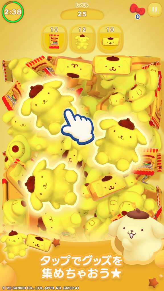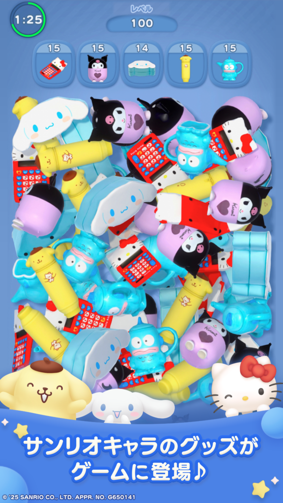 ルールは「山積みにされた無数のキャラクターグッズの中から、同一のグッズを3つタップするだけ」というものです。複雑な操作やテクニックは一切不要で、誰でもすぐに楽しむことができます。クリア条件は、お題として指定されたグッズを全て見つけ出すことです。