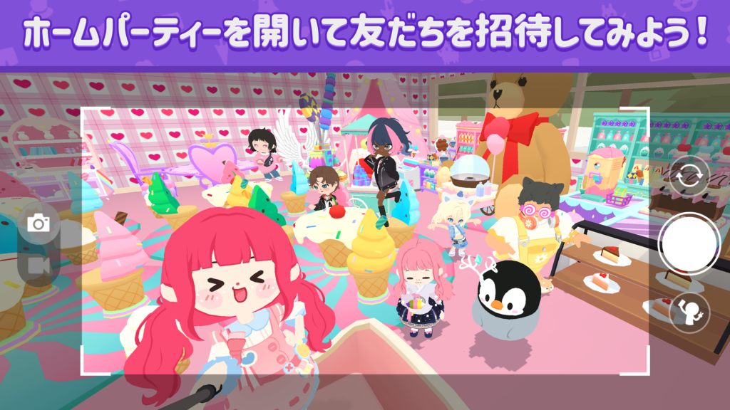 • 自由度の高い部屋作り 家具、壁紙、床材、装飾品など、多種多様なアイテムを自由に配置して自分好みの空間を作り上げることができます。自慢の部屋にフレンドを招待して「ホームパーティ」を開き、チャットやゲームで交流を深めることも本作の醍醐味です。他のプレイヤーの家を自由に訪問して、インテリアの参考にすることも可能です。