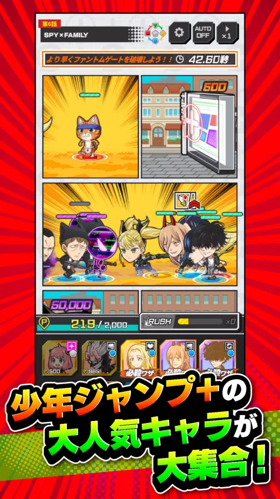 プレイヤーは、『SPY×FAMILY』『怪獣8号』『ダンダダン』といった人気作品から集結したキャラクターたちでチームを編成し、敵の拠点を破壊することを目指します。デフォルメされた可愛いミニキャラクターたちが漫画のコマを舞台に大乱闘を繰り広げる様子は、原作ファンならずとも必見のクオリティです。