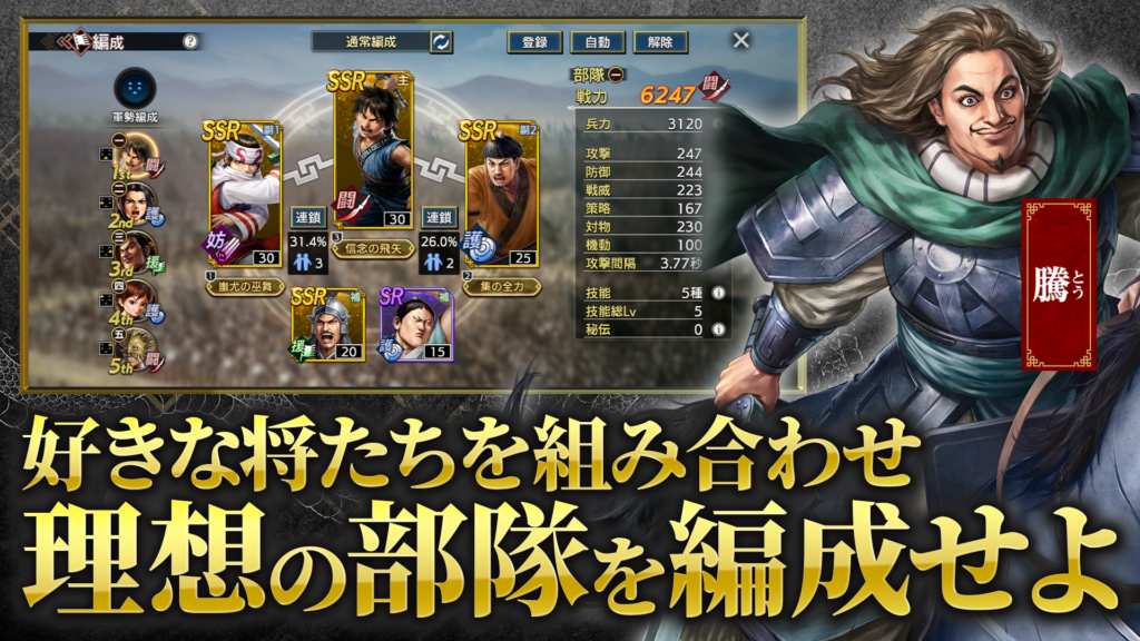 信、嬴政、王騎、羌瘣、楊端和など、『キングダム』でおなじみの人気キャラクターが多数登場します。それぞれの武将が持つ必殺技や個性は戦闘シーンに反映されており、ファンとしては自分の部隊に原作キャラクターを編成して共に戦えるのは「最高」の喜びだとされています。