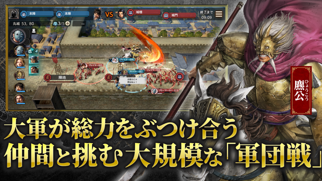 本作の戦闘は、最大30人対30人という圧倒的な迫力を持つ軍団戦として展開されます。この大規模な合戦において、仲間(軍団メンバー)との連携や、いかに戦略的な進軍ルートを選択するかが、戦いの勝敗を大きく左右します。