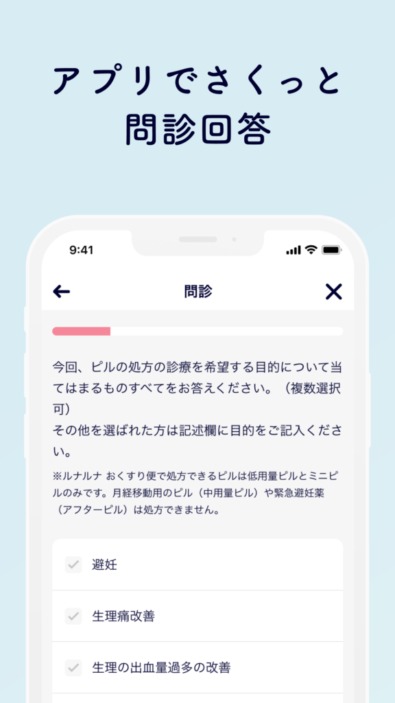 - アプリのダウンロードと問診回答: 「ルナルナ おくすり便」アプリをインストールし、本人情報(住所・氏名など)を登録後、問診フォームに現在の体調や既往歴、ピルの服用目的などを入力します。