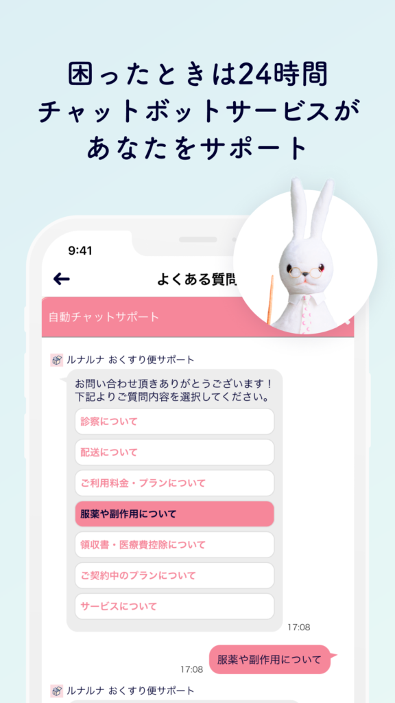 Q. 副作用が出た場合は? A. 飲み始めに吐き気や頭痛、不正出血などのマイナートラブルが起こることがありますが、多くは数ヶ月で軽減します。ただし、激しい腹痛やふくらはぎの痛みなど、血栓症の疑いがある場合は直ちに医療機関を受診してください。また、アプリ内の24時間対応チャットボットで相談することも可能です。