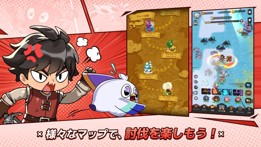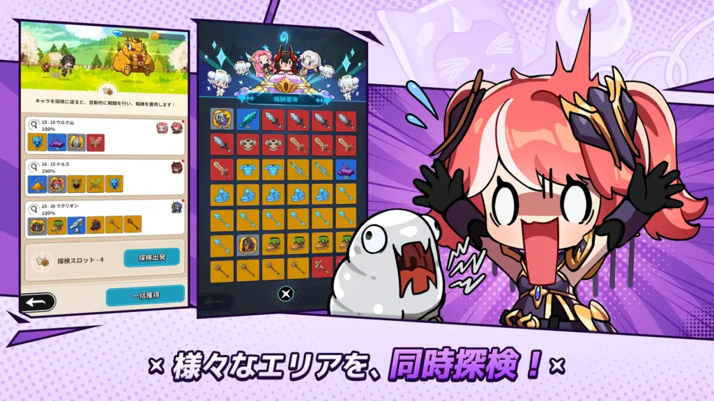 『ミュー:ポケットナイツ』の最大の特徴は、ゲームを起動していない間も、キャラクターが自動で敵と戦い、経験値や装備、ゲーム内通貨を集めてくれる放置報酬システム(探検報酬)です。これにより、忙しい社会人や学生でも時間を効率的に使いながらゲームを楽しむことができます。
