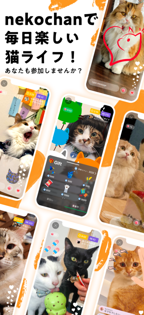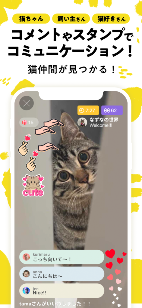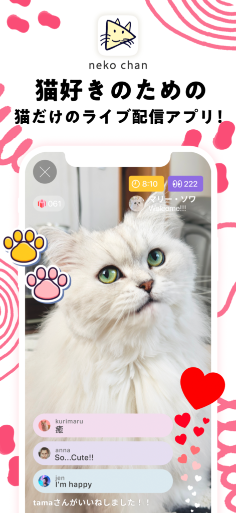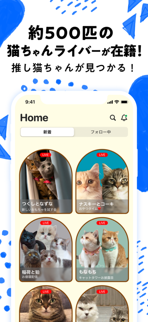 - 猫限定のライブ配信アプリ:主役はあくまで猫であり、ほかのライブ配信アプリでは見られない、猫専門のコンテンツを提供しています。