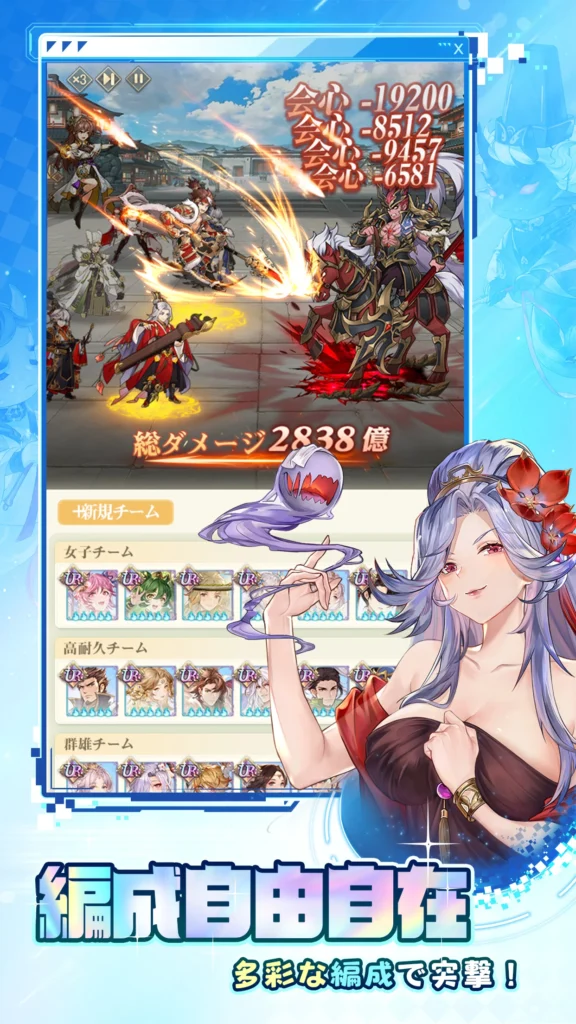 戦闘は最大6体のキャラクターを編成して戦うターン制のフルオート形式です。プレイヤーに求められるのは、戦闘中の操作ではなく「誰をどこに配置するか」という軍師としての視点です。