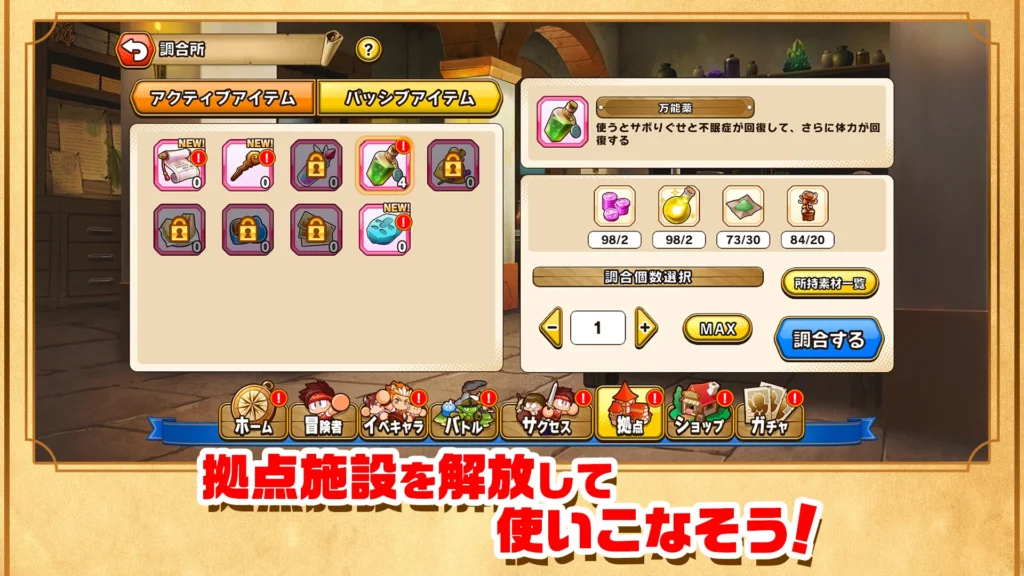 メインクエストが進むと、プレイヤーの拠点も成長していきます。アイテムを調合してサクセスに持ち込むアイテムを作る「調合所」や、新たなジョブの解放など、コンテンツが次々とアンロックされるため、飽きさせない工夫が随所に凝らされています。