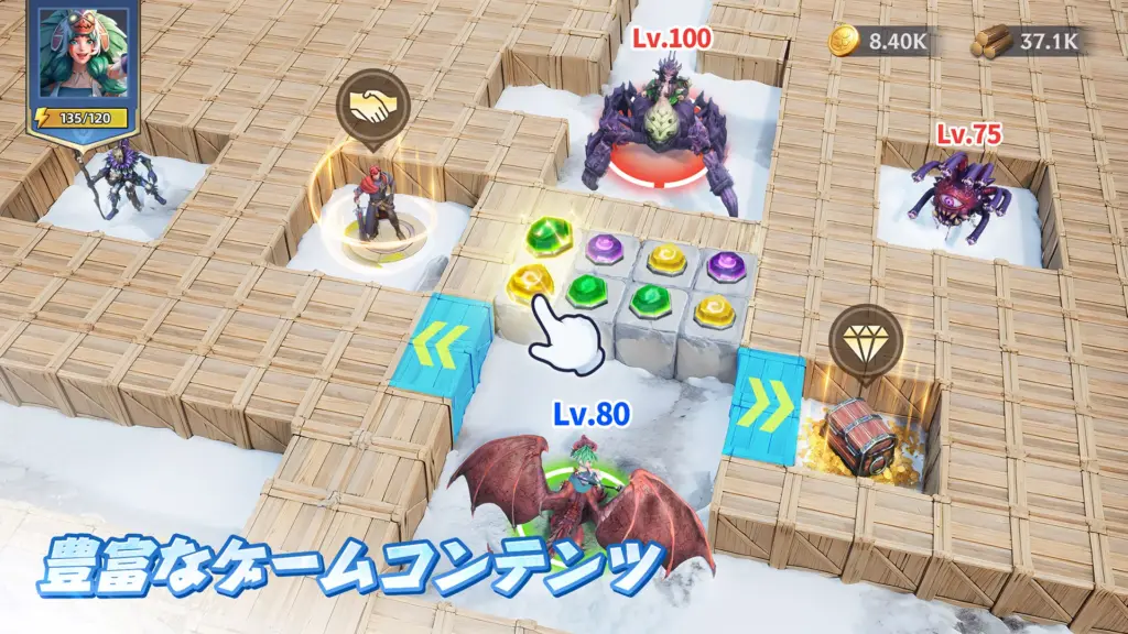 連鎖の爽快感 パズルバトルは、消し方次第でサクサクとコンボが繋がっていくようにデザインされており、マッチ3パズルの中でも連鎖になりやすい傾向があります。戦略的な思考でピースを消すことで大連鎖が続き、大ダメージをモンスターに与える時の快感は格別です。