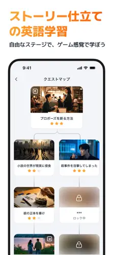 これらのストーリーは難易度別に分けられており、自分のレベルに合ったものを選んで「クエスト(お題)」をクリアしていく形式です。