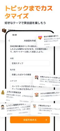 レストラン、観光地、タクシーなど、日常の具体的なシーンでのやり取りを練習できるモードです。事前練習なしで本番さながらの会話に挑戦できるため、実践的な瞬発力を養うのに最適です。