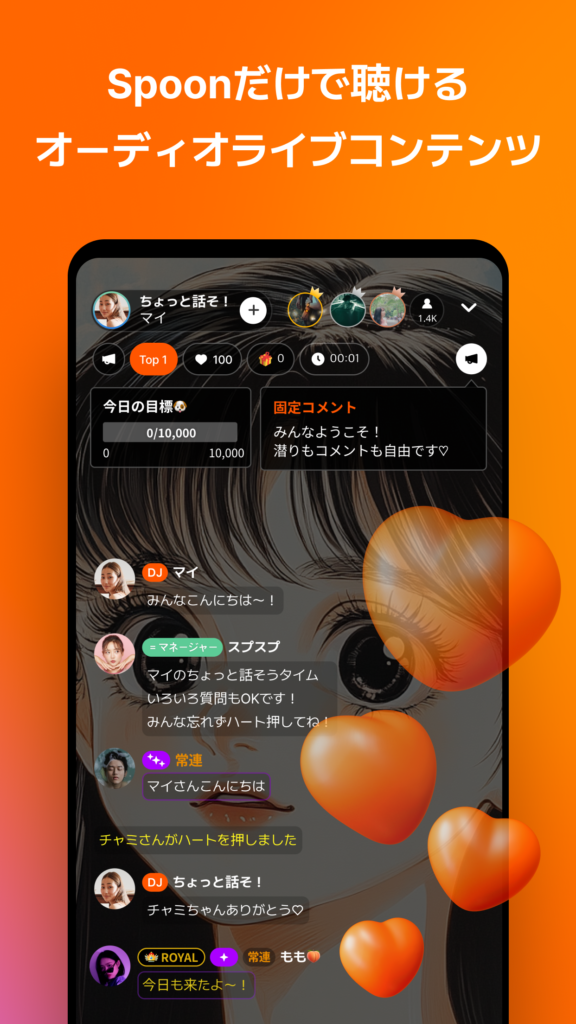 Spoon内では、ユーザーは「スプナー」と呼ばれ、顔を出すことなく声だけでコミュニケーションを楽しみます。雑談配信から、癒やしの「寝落ち配信」、本格的な声劇、ボイスドラマ、ボカロ、ASMRなど、多岐にわたるジャンルの配信が行われているのが特徴です。
