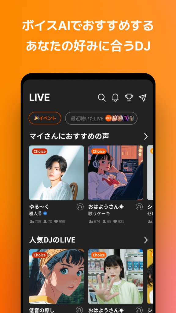 - LIVE(ライブ配信) リアルタイムで音声を配信・視聴する機能です。DJとリスナーがチャットを通じて直接コミュニケーションを取ることができ、現在のメインコンテンツとなっています。