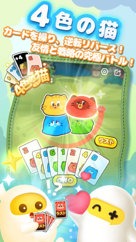 - 対戦バトル・4色の猫:世界中で愛されている定番のカードゲームが「TopTop」に登場しています。同じ色や数字のカードを場に出していき、いち早く手札をゼロにしたプレイヤーが勝利となります。「+2」や「+4」といった特殊カードで相手を妨害する、運と戦略が絡み合う白熱のバトルが楽しめます。このゲームは1プレイが大体3分で遊べるため、気軽に楽しめる魅力の一つです。