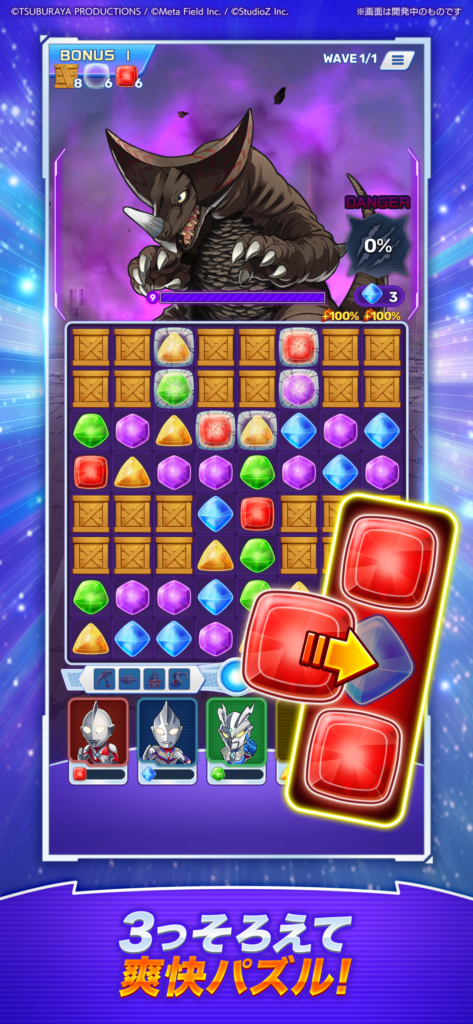 パズシュワは、ゲームシステムとして、誰でも気軽に遊びやすいマッチ3パズル形式を採用しています。このシンプルなルールは、ゲームの得意不得意に関係なく、全てのウルトラマンシリーズファンに楽しんでもらえるように設計されています。