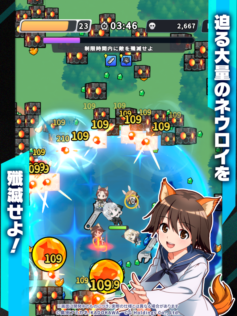 本作の核となるゲームシステムは、無限に襲い掛かってくる敵「ネウロイ」を倒しまくるアクションが展開される点です。操作は非常にシンプルで、画面上のバーチャルパッドを使い、移動・攻撃・スキル発動を直感的に行える設計になっています。アクションゲームが苦手なユーザーでもすぐに馴染める点が特徴です。