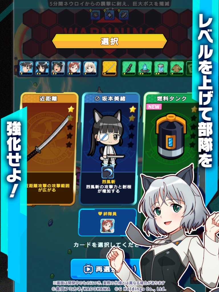 - 出撃キャラクターのランダム性: プレイヤーが操作する自機キャラクターを含め、出撃キャラが完全ランダム(3択から選択)で決まるため、推しキャラクターで常に遊びたいというキャラゲーの欲求が満たしにくい可能性があります。