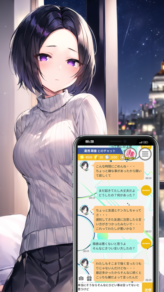 ストーリーモードをクリアすることで、その女の子との「フリーチャット」が解放されます。フリーチャットでは、用意された選択肢に縛られず、あなた自身の言葉で、女の子と好きなだけ自由に会話を楽しむことができます。